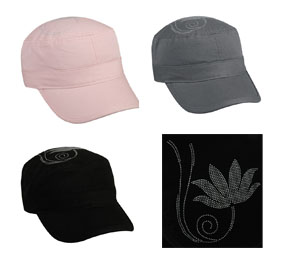 Available in 3 different colors, this hat is embellished with a silver studded flower design on top. Add your logo for even more embellishment!